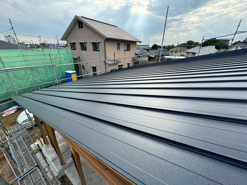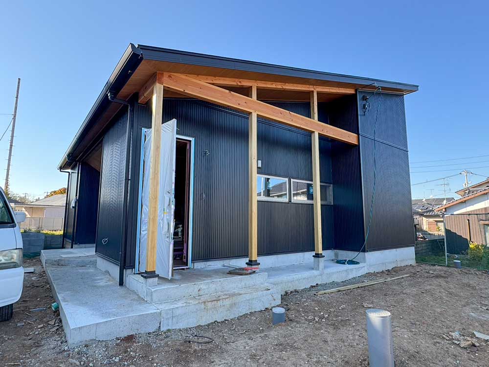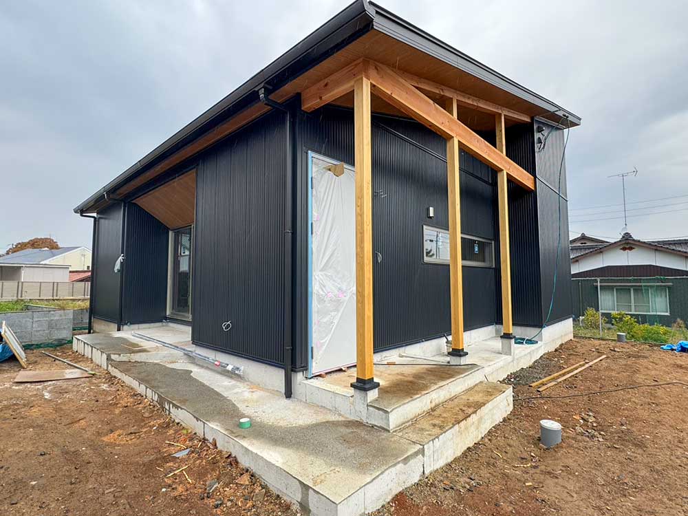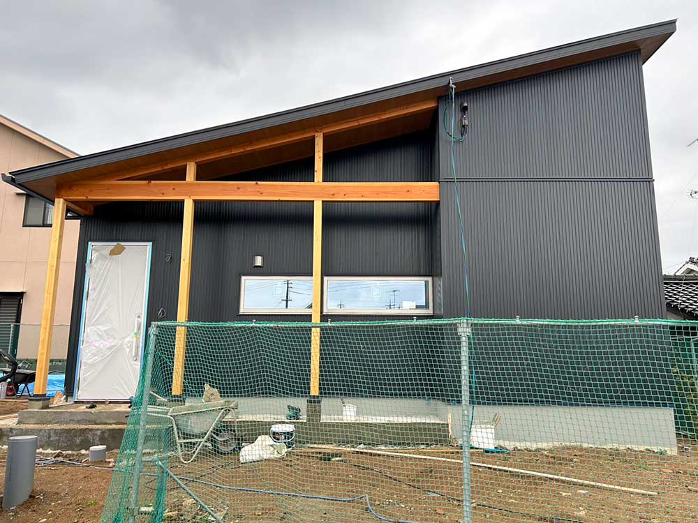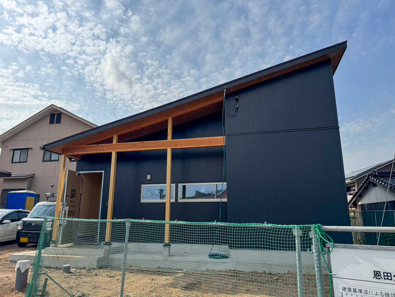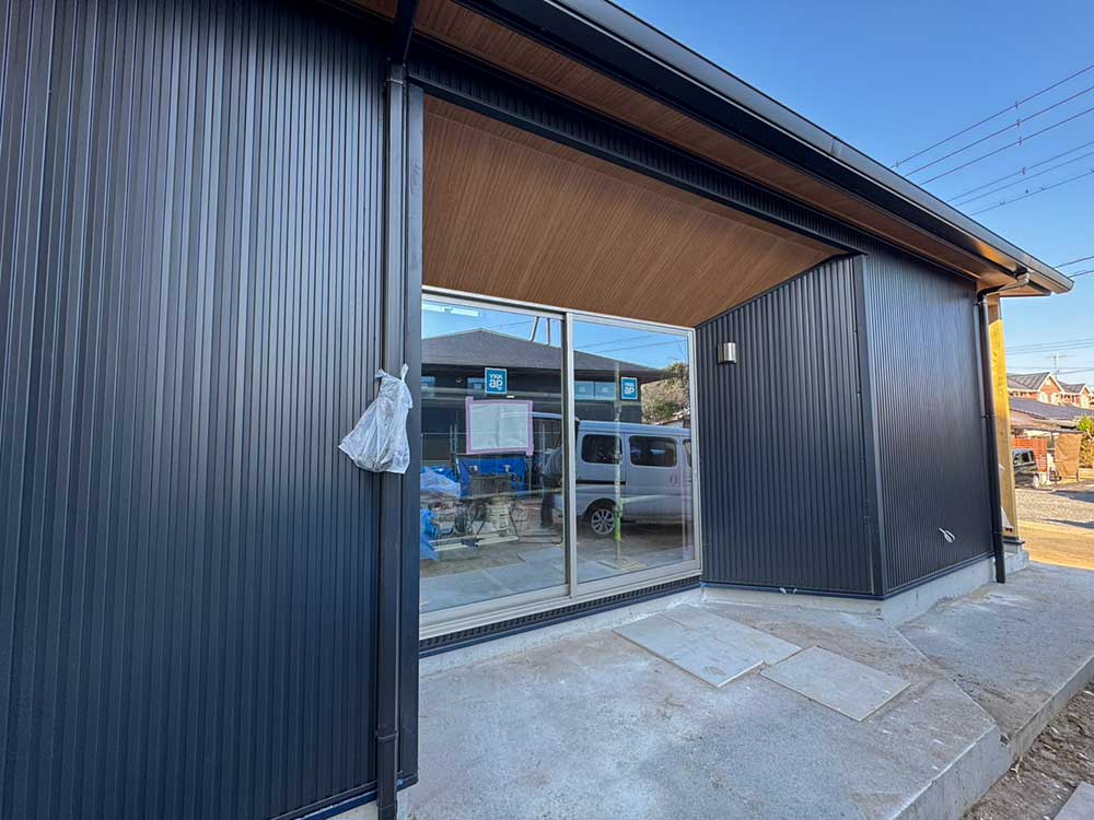 ブラックのガルバリウムに梁と柱が調和。 数十年後も飽きのこないシンプルな外観と、 平屋ならではの勾配天井が魅力です。