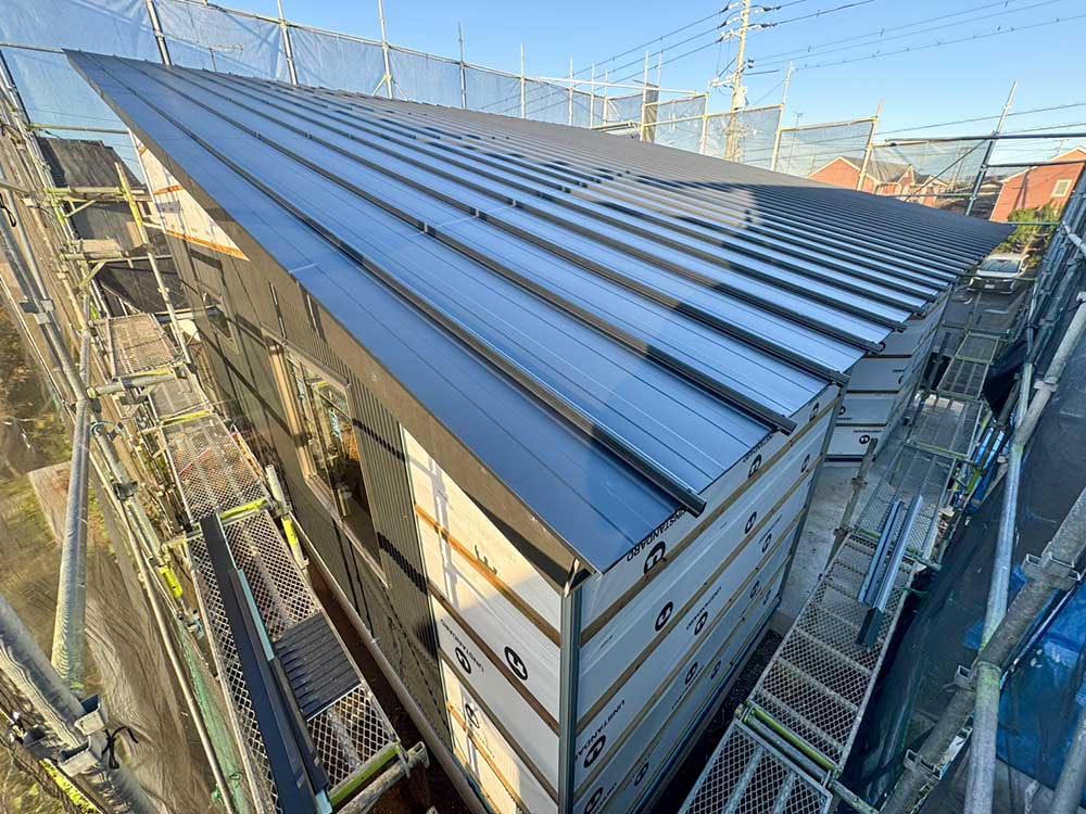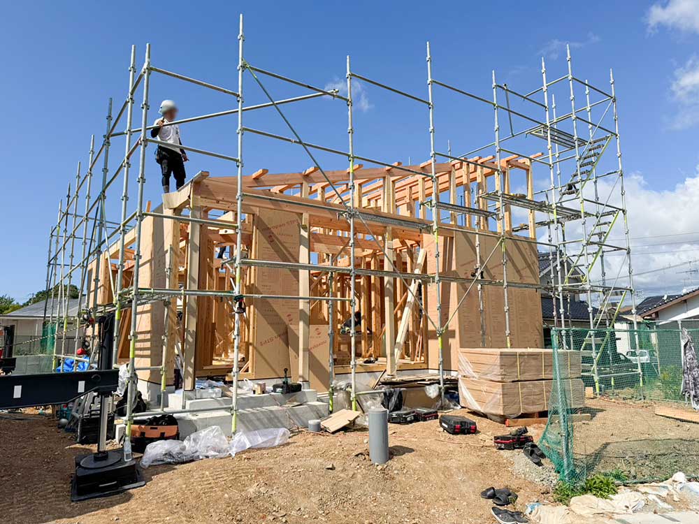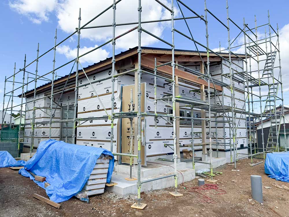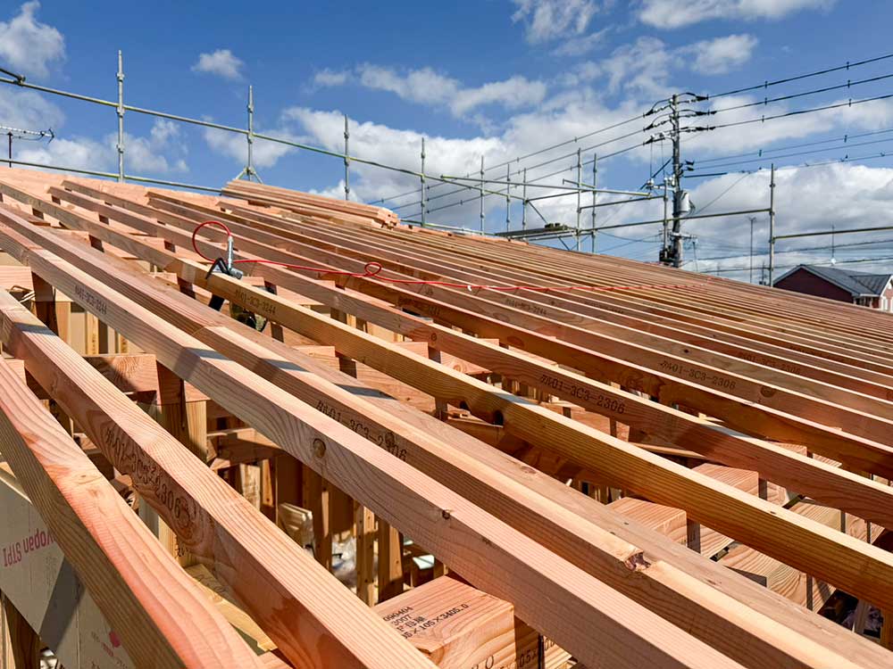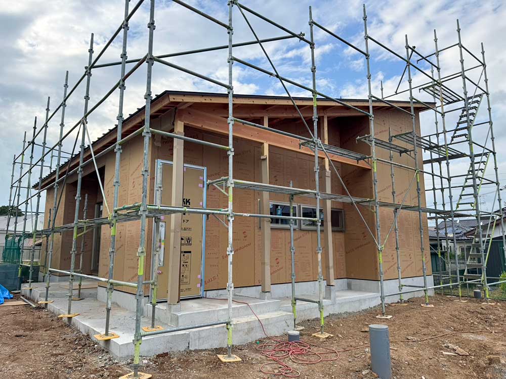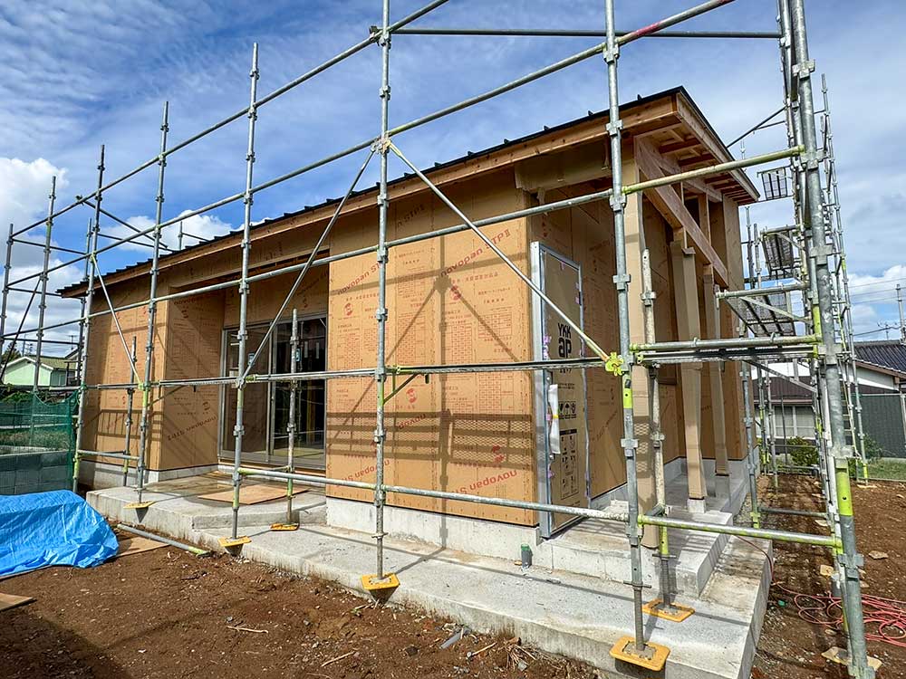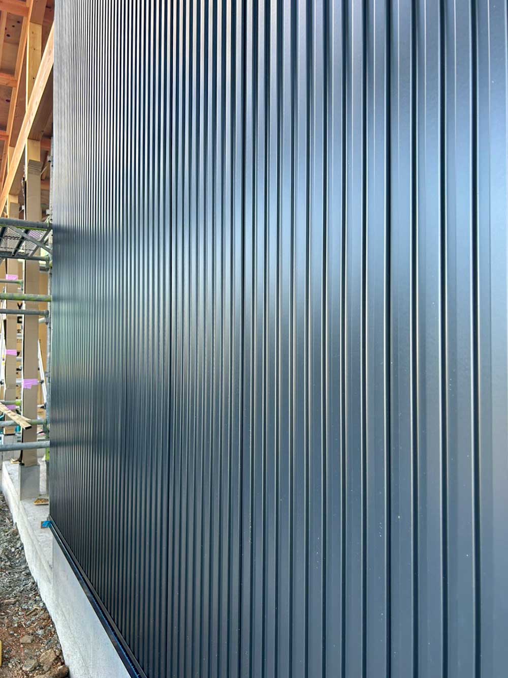 ブラックのガルバリウムに梁と柱が調和。 数十年後も飽きのこないシンプルな外観と、 平屋ならではの勾配天井が魅力です。