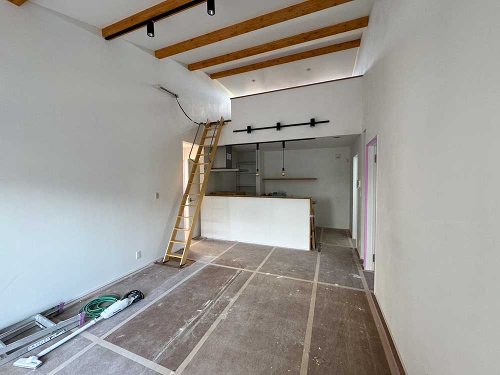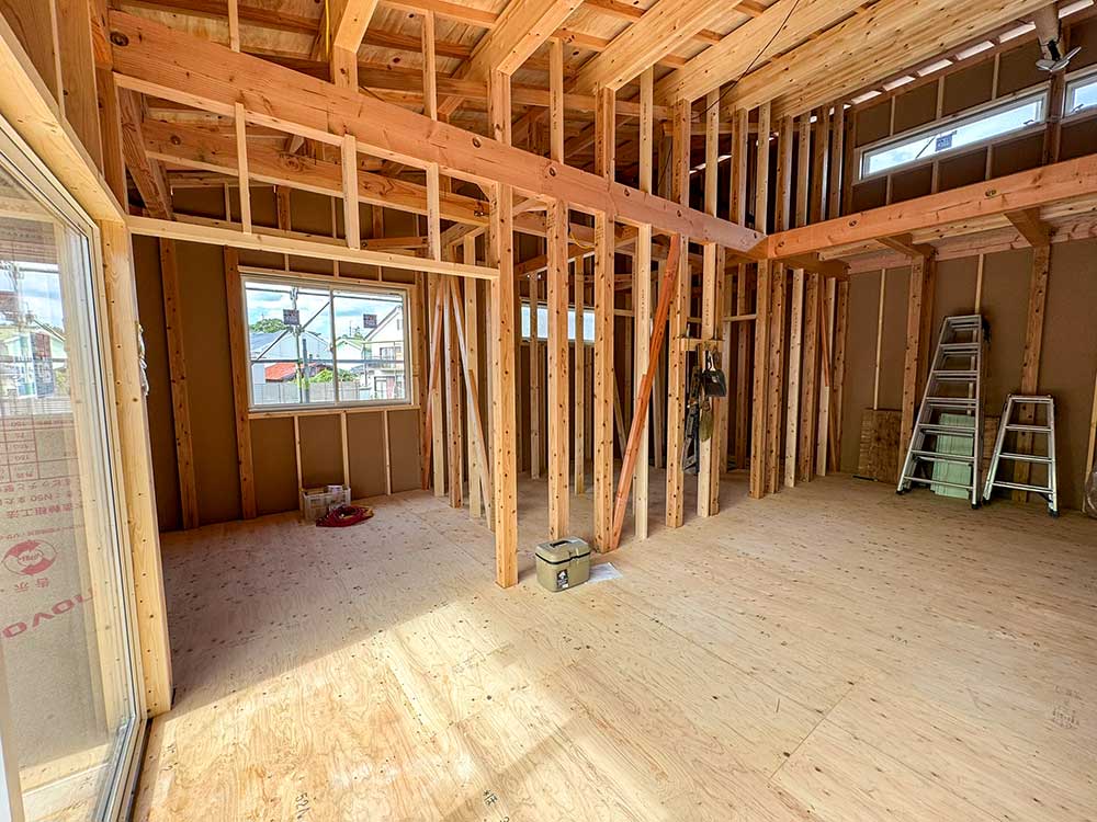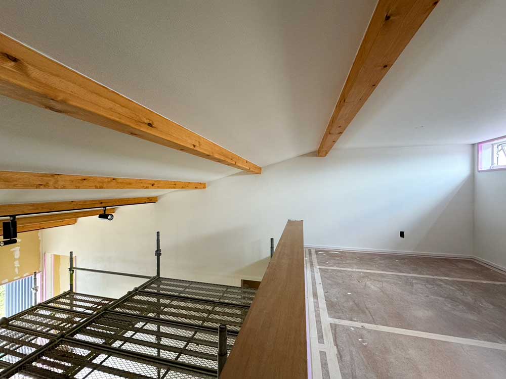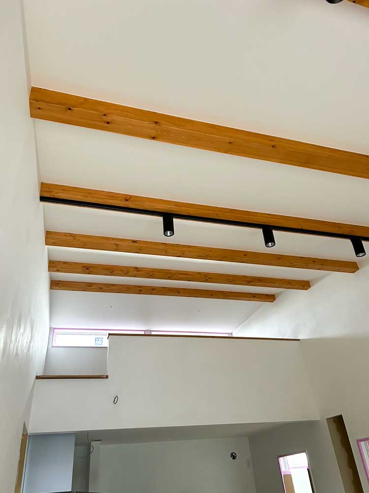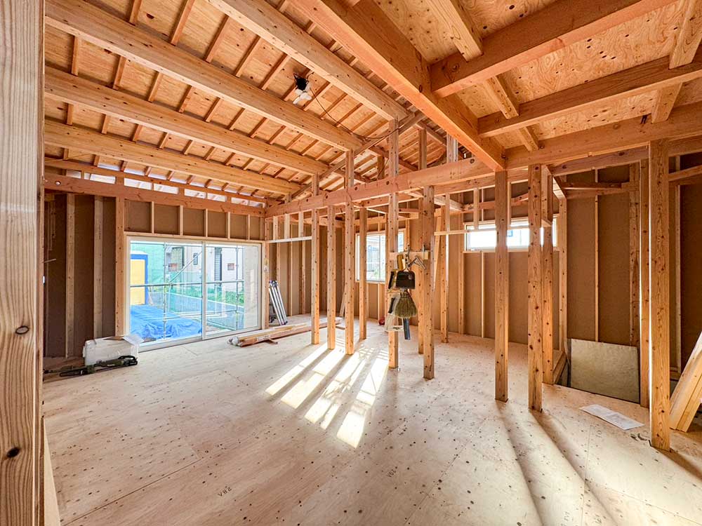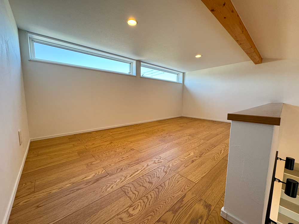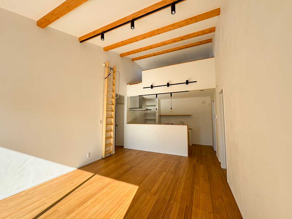 梁をあらわしにした広々とした空間。無垢のフロアが心地よく、 大きな窓から差し込む光と勾配天井が、リビングをより開放的に感じさせます。