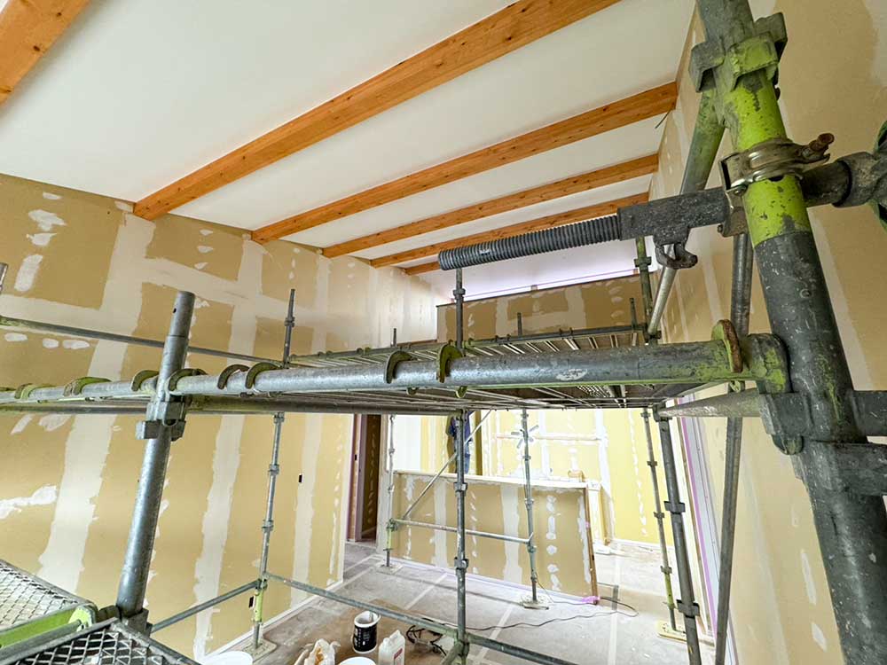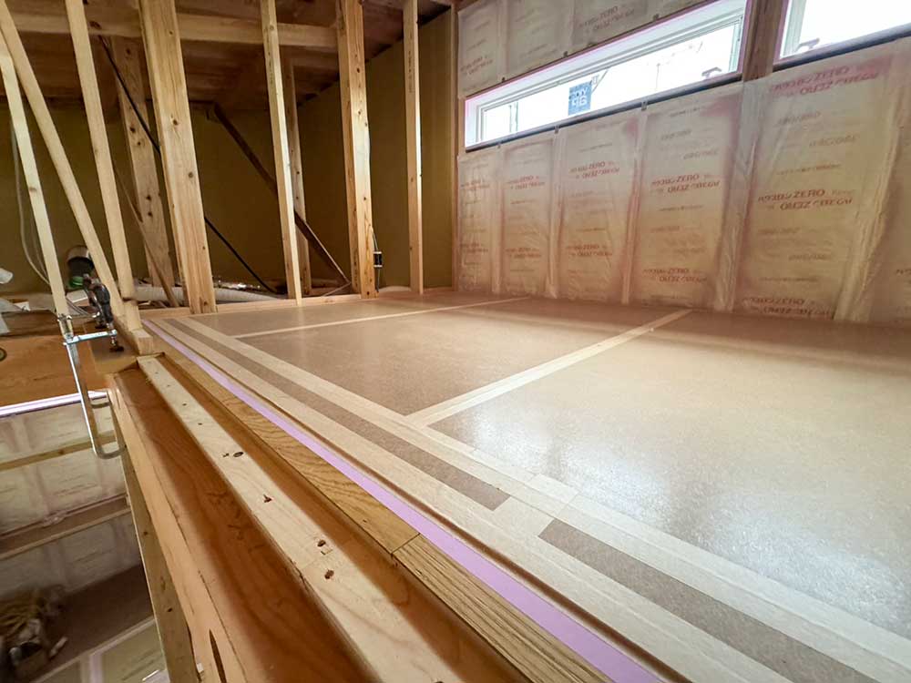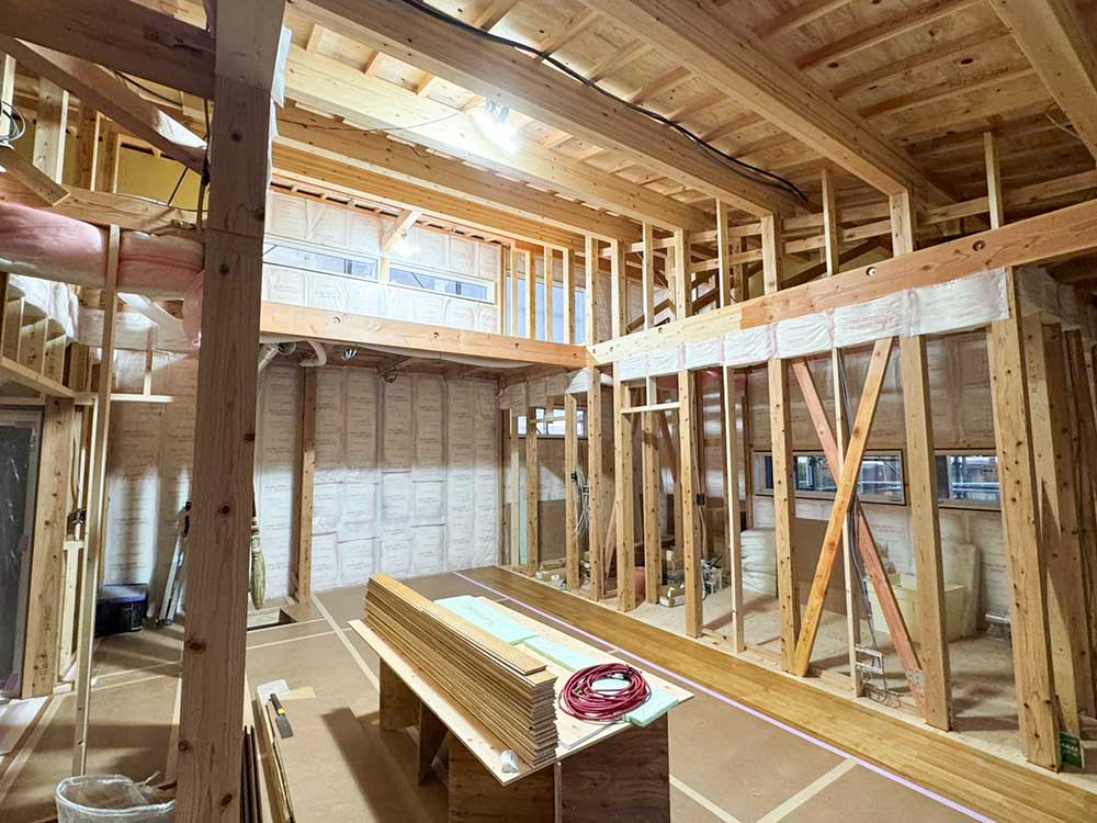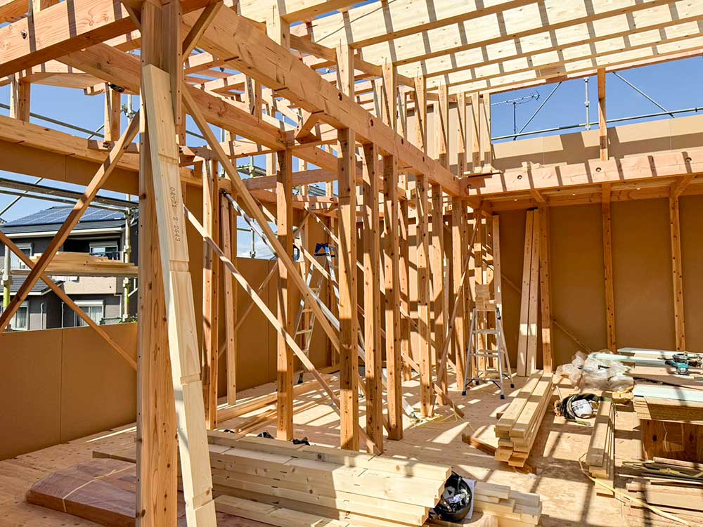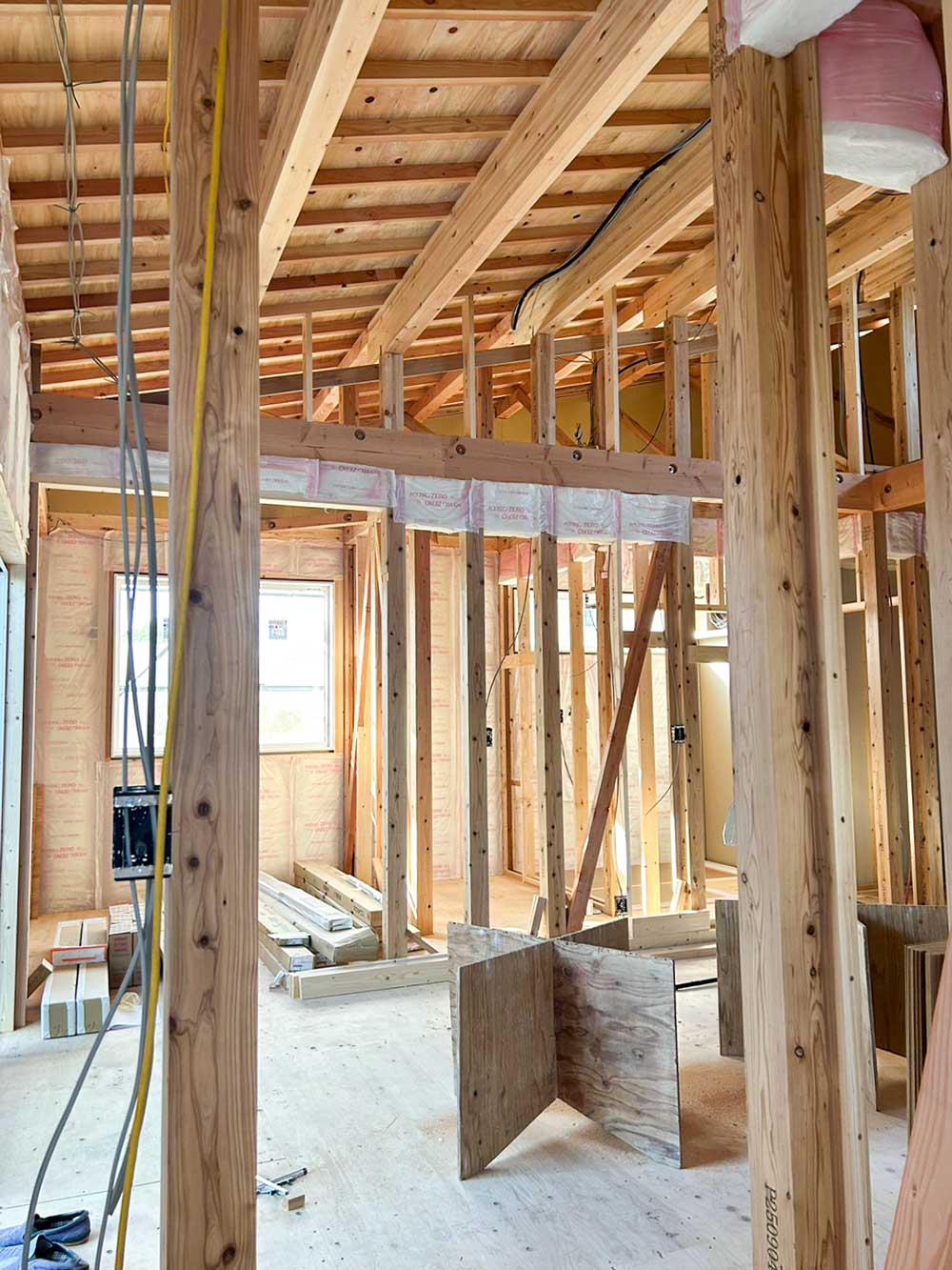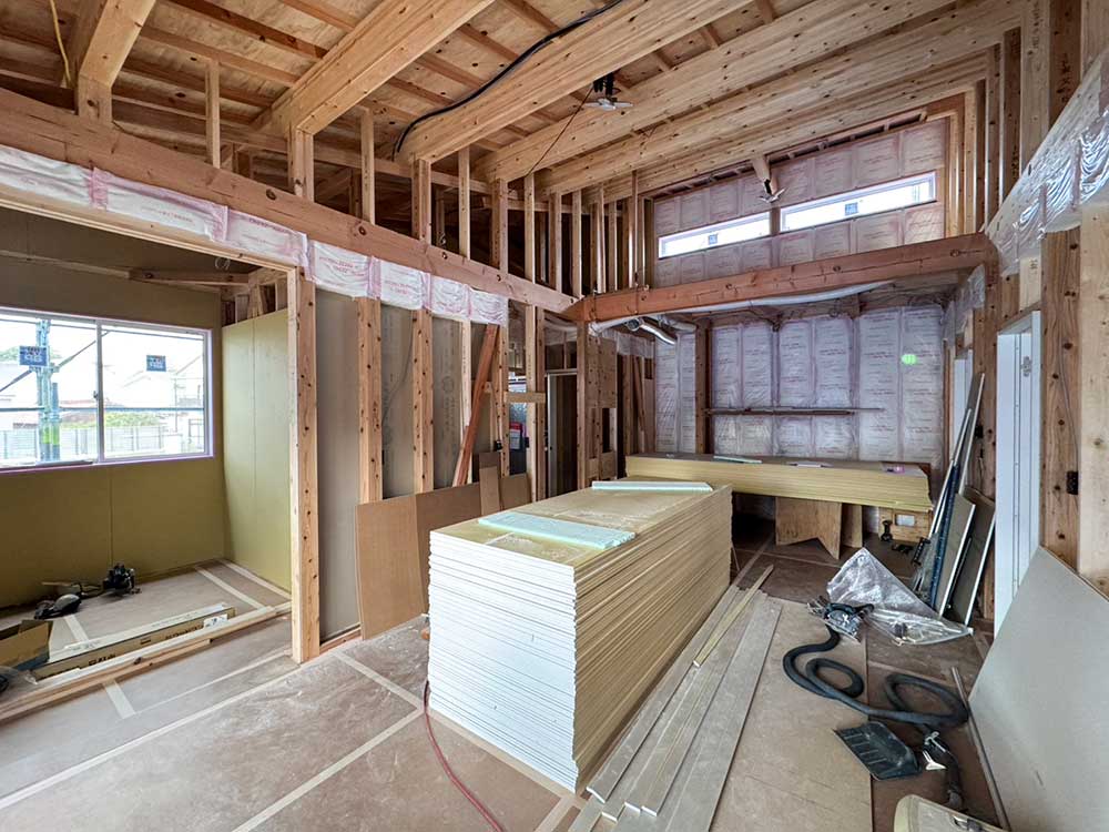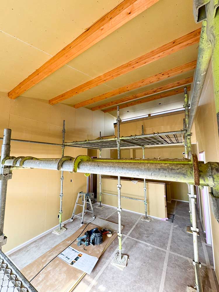 梁をあらわしにした広々とした空間。無垢のフロアが心地よく、 大きな窓から差し込む光と勾配天井が、リビングをより開放的に感じさせます。